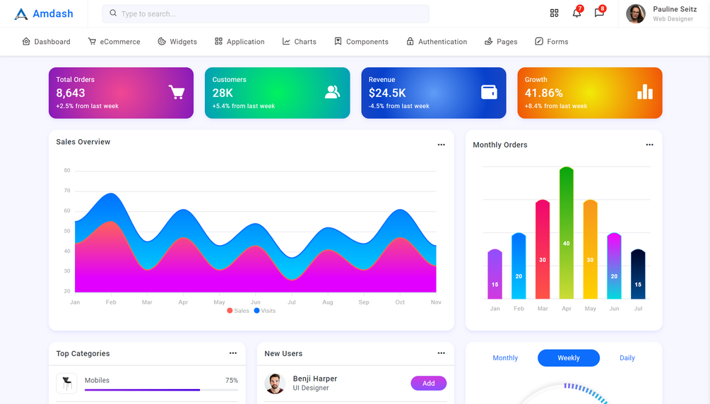 Amdash is a responsive bootstrap 5 admin template. It has multiple dashboard variations. It is built with the latest bootstrap 5 frameworks. It works on all major web browsers, desktops, and all smartphone devices. It is a very easy-to-customize and developer-friendly template. It has a huge collection of UI components with the latest jQuery & bootstrap plugins. It can be used for any type of web applications eCommerce dashboard, custom admin panel, project management admin, CRM, cms, etc.
