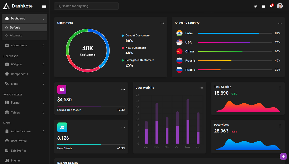 Dashkote is a responsive bootstrap 5 admin template. It has multiple dashboard variations. It is built with the latest bootstrap 5 frameworks. It works on all major web browsers, desktops, and all smartphone devices. It is a very easy-to-customize and developer-friendly template. It has a huge collection of UI components with the latest jQuery & bootstrap plugins. It can be used for any type of web applications eCommerce dashboard, custom admin panel, project management admin, CRM, cms, etc.
