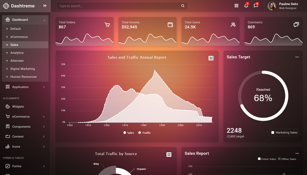Dashtreme is a fully responsive Bootstrap 5 admin dashboard template. It is built with the Bootstrap 5 frameworks, HTML5, CSS, and JQuery. It works on all major web browsers, desktops, and all smartphone devices. It is a very easy-to-customize and developer-friendly template. It has a vast collection of UI components with the latest jQuery and Bootstrap plugins. It can be used for any type of web application eCommerce dashboard, custom admin panel, project management admin, CRM, CMS, etc.
