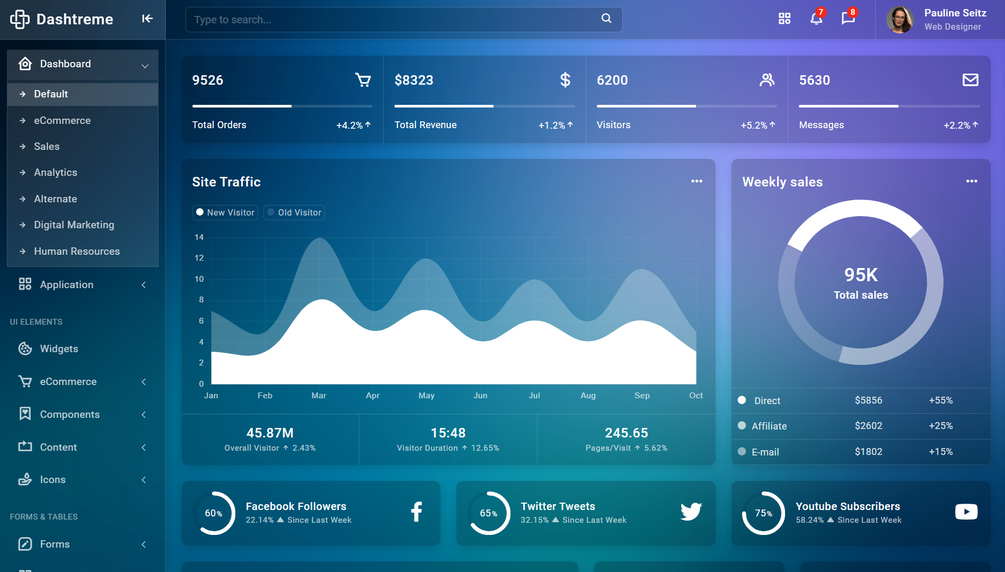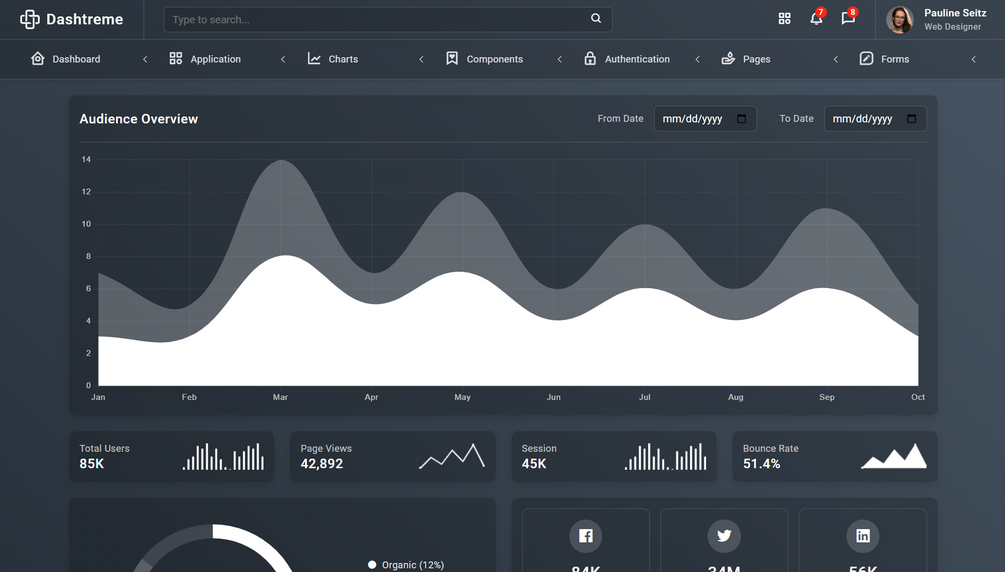 Dashtreme is a fully responsive Bootstrap 5 admin dashboard template. It is built with the Bootstrap 5 frameworks, HTML5, CSS, and JQuery. It works on all major web browsers, desktops, and all smartphone devices. It is a very easy-to-customize and developer-friendly template. It has a vast collection of UI components with the latest jQuery and Bootstrap plugins. It can be used for any type of web application eCommerce dashboard, custom admin panel, project management admin, CRM, CMS, etc.