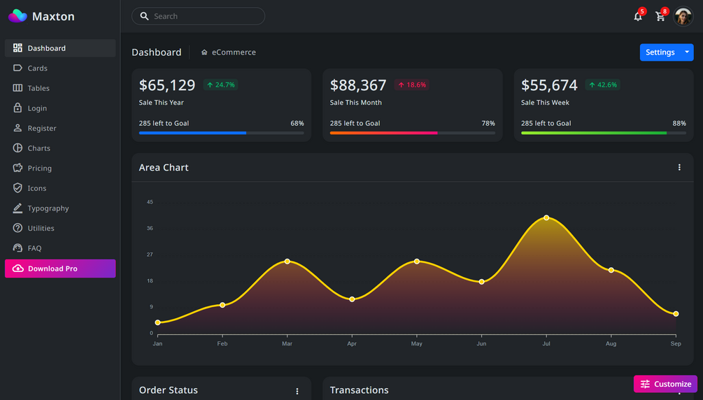 Maxton Admin is based on the Bootstrap 5 framework. It is a powerful and developer-friendly admin template. It is based on Sass. It includes color, light, and dark dashboards. It features a vast collection of UI components, including the latest jQuery Bootstrap plugins. It is fully responsive and works with all major web browsers, desktops, and smartphones. It is usable for building all types of Web applications, such as custom admin dashboards, e-commerce web applications, CMS, or CRM web apps.