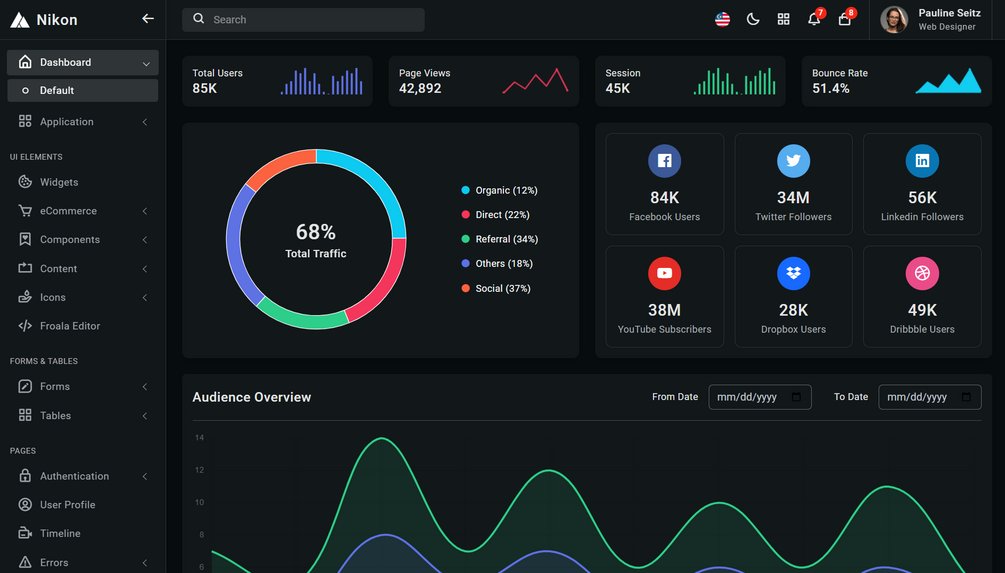 Nikon Admin is a full-featured, multipurpose, bootstrap 5 admin template. It is created with Bootstrap 5 Framework, HTML5, CSS, and JQuery. It is very simple and developer-friendly. It has a huge collection of UI components with the latest jQuery & bootstrap plugins. It is a fully responsive template. It is useable for building all types of Web applications like custom admin dashboards, eCommerce web applications, cms, or CRM web apps.