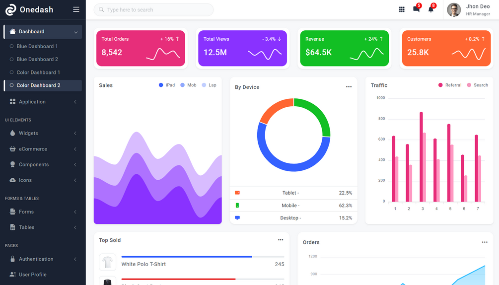 Onedash is a responsive bootstrap 5 admin template. It has multiple dashboard variations. It is built with the latest bootstrap 5 frameworks. It works on all major web browsers, desktops, and all smartphone devices. It is a very easy-to-customize and developer-friendly template. It has a huge collection of UI components with the latest jQuery & bootstrap plugins. It can be used for any type of web application eCommerce dashboard, custom admin panel, project management admin, CRM, cms, etc.
