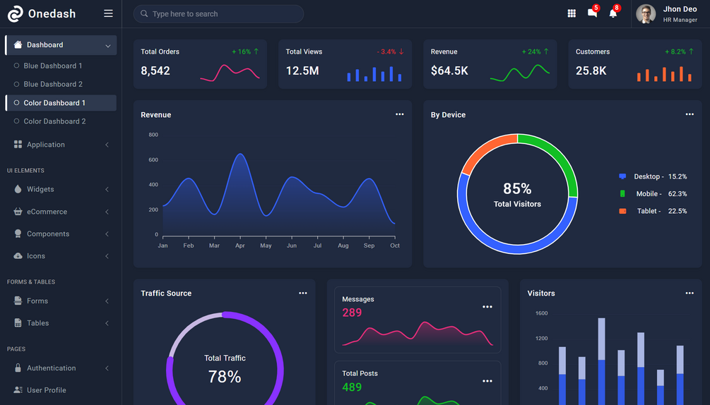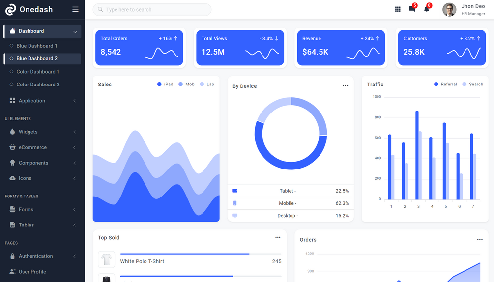 Onedash is a responsive bootstrap 5 admin template. It has multiple dashboard variations. It is built with the latest bootstrap 5 frameworks. It works on all major web browsers, desktops, and all smartphone devices. It is a very easy-to-customize and developer-friendly template. It has a huge collection of UI components with the latest jQuery & bootstrap plugins. It can be used for any type of web application eCommerce dashboard, custom admin panel, project management admin, CRM, cms, etc.