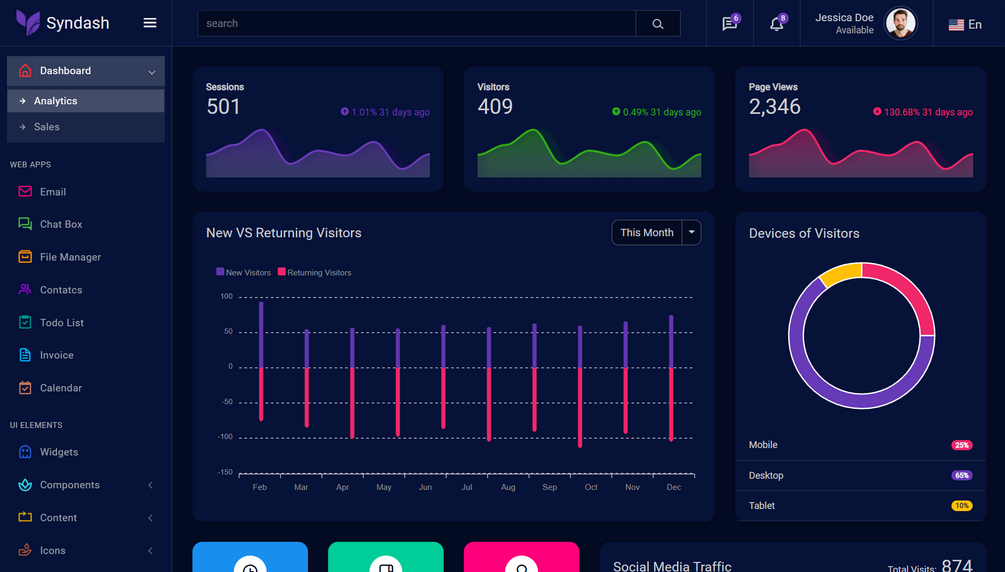 Syndash is a responsive bootstrap 4 admin template. It has multiple dashboard variations. It is built with the latest bootstrap 4 frameworks. It works on all major web browsers, desktops, and all smartphone devices. It is very easy to customize and developer friendly template. It has a huge collection of UI components with the latest jQuery & bootstrap plugins. It can be used for any type of web application eCommerce dashboard, custom admin panel, project management admin, CRM, cms, etc.