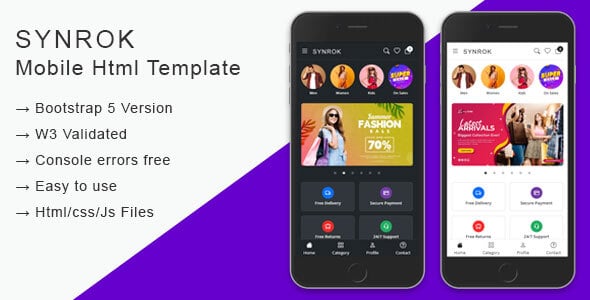 Synrok is a mobile based eCommerce HTML template. It is developed with the latest version of the bootstrap 5 frameworks. It has multiple UI components. It perfectly works in all browsers with fast speed. Code quality is awesome and well written. Every developer who has basic knowledge of HTML can work with this template. It is related to the fashion eCommerce industry. It is totally w3 validated and has 0 console errors. All authentication pages are available in the product. By using this template HTML based mobile application can be developed. This template is available in dark and light modes.