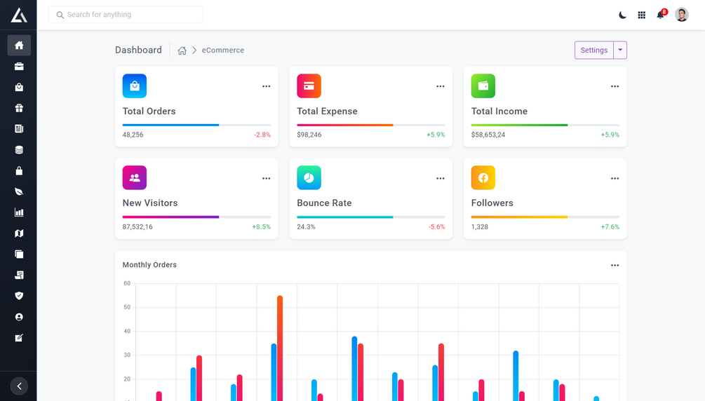 SYN-UI is a responsive bootstrap 5 admin template. It has multiple dashboard variations. It is built with the latest bootstrap 5 frameworks. It works on all major web browsers, desktops, and all smartphone devices. It is a very easy-to-customize and developer-friendly template. It has a huge collection of UI components with the latest jQuery & bootstrap plugins. It can be used for any type of web application eCommerce dashboard, custom admin panel, project management admin, CRM, cms, etc.
